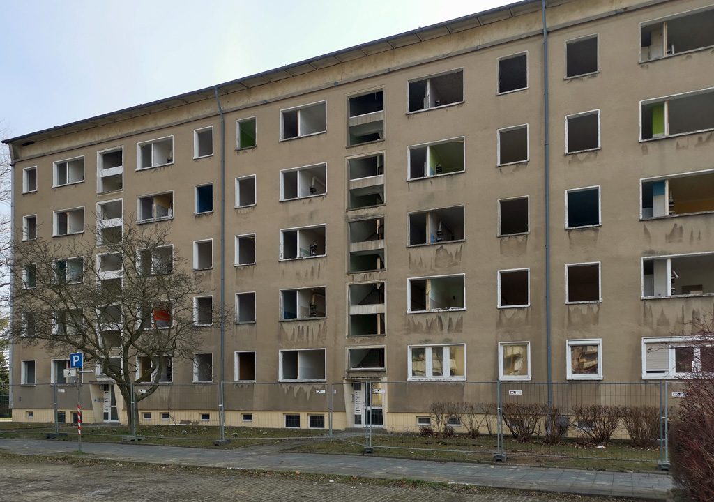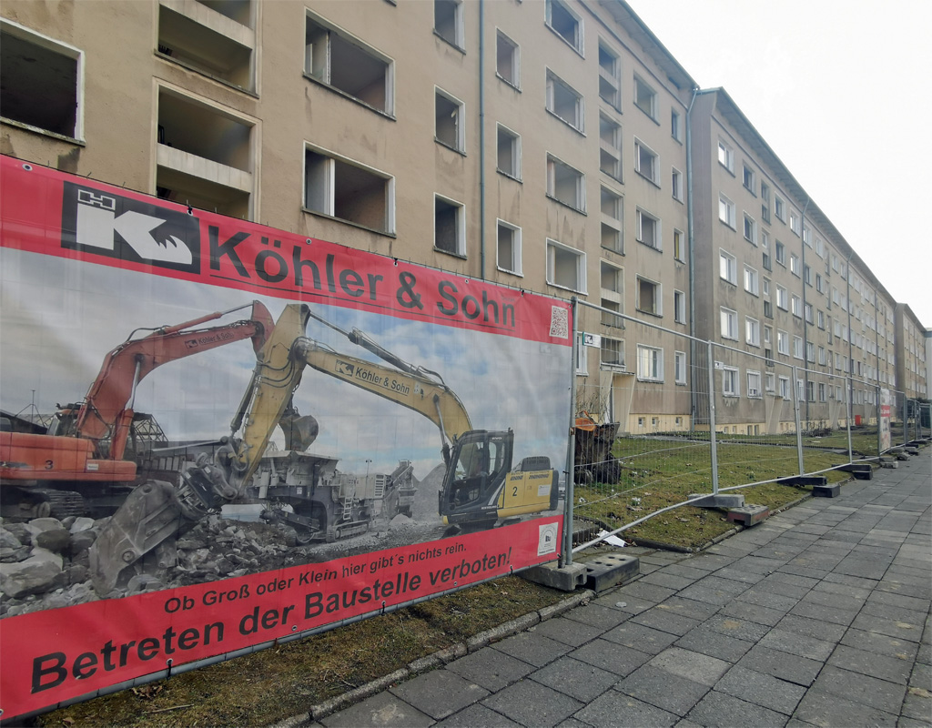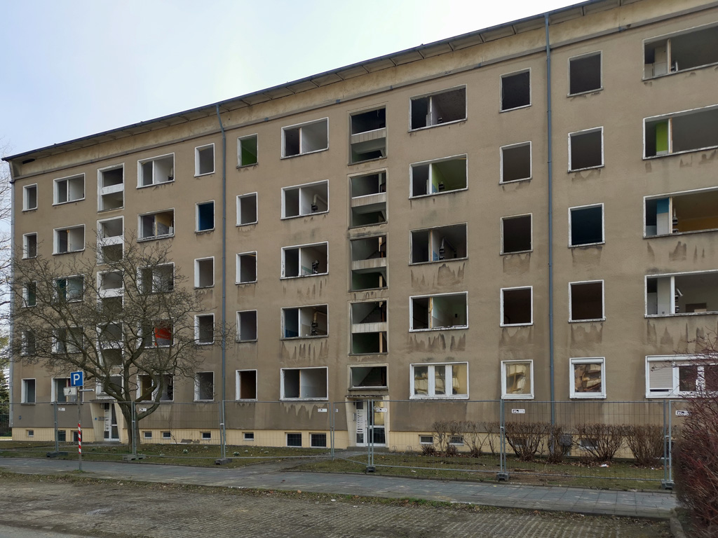 Nun hat die Komplettsanierung unseres Blocks Arthur-Ullrich-Straße 1-23 richtig begonnen. Alle alten Fenster sind ausgebaut, sodass der lange leere Block jetzt fast ein bisschen unheimlich wirkt. Ein Teil der Fenster bekommt bei anderen Bauprojekten ein zweites Leben. Der Bauzaun über die gesamte Länge des Gebäudes schirmt die Baustelle ab.