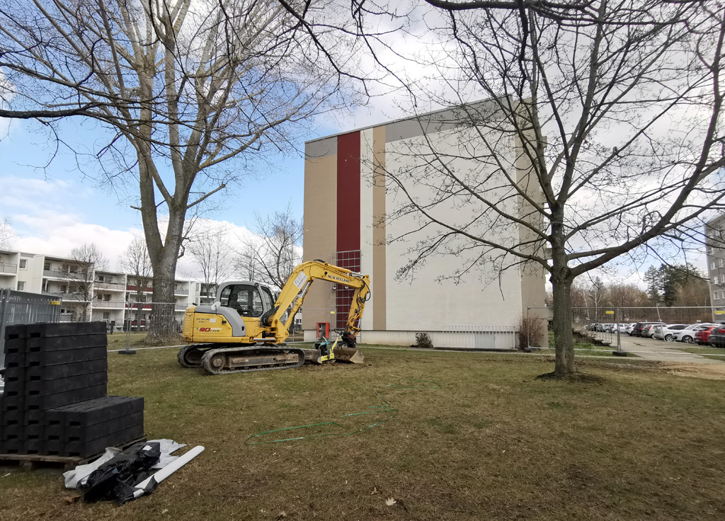 Der Bagger steht bereit, es geht los. Am Alexander-Bolze-Hof 4-12 haben die Arbeiten für die energetische Sanierung begonnen. Dieser Block ist der letzte des sogenannten Bolze-Karees, der auf diese Baumaßnahme wartet. Dann sind alle Häuser rund um den Hof Bolze-Hof, Lausitzer Straße und Schlesische Straße mit Wärmedämmung und XXL-Balkonen saniert.
