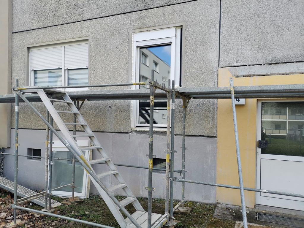 Bis dahin vergehen aber noch ein paar Monate. Der erste Schritt in dieser Woche war der Umbau der Fenster in den Erdgeschosswohnungen zur Hofseite hin. Pro Wohnung wurde ein Zugang zu den künftigen Mietergärten geschaffen und eine große Balkontür eingebaut.