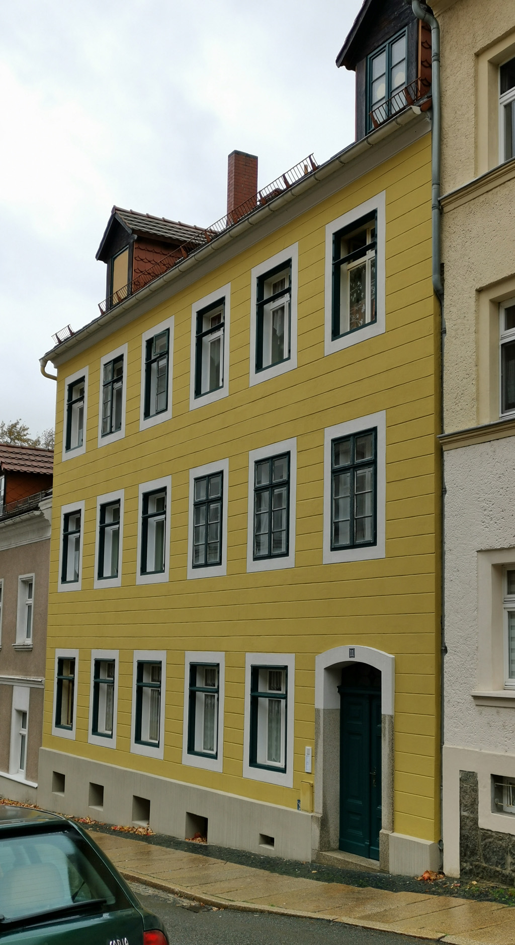 Am unteren Abschnitt der Sonnenstraße erstrahlt ein Haus in frischen sonnigen Farben. Wir haben die Fassadensanierung unserer Sonnenstraße 11 fast abgeschlossen. Gestern wurden die Gerüste abgebaut.