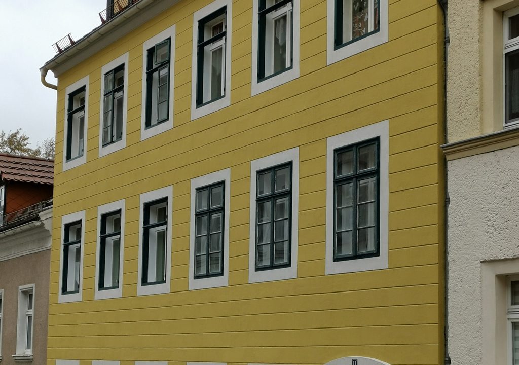 Am unteren Abschnitt der Sonnenstraße erstrahlt ein Haus in frischen sonnigen Farben. Wir haben die Fassadensanierung unserer Sonnenstraße 11 fast abgeschlossen. Gestern wurden die Gerüste abgebaut.